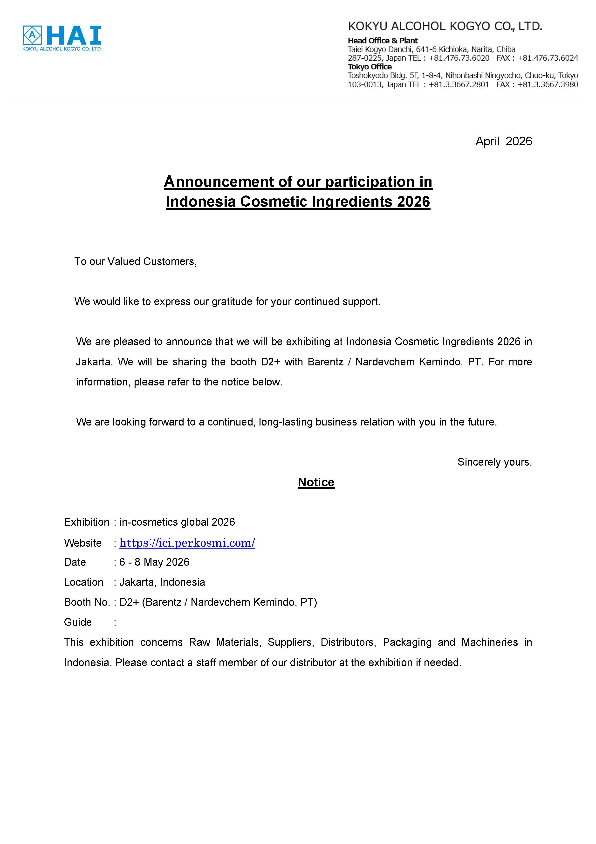 Announcement of our participation in Indonesia Cosmetic Ingredients 2026